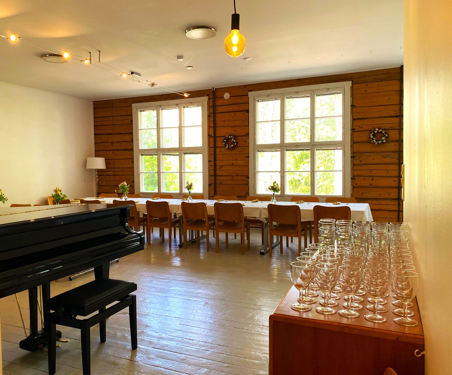Saliin mahtuu pöytiin katettuna noin 40 vierasta, ja ilman katettuja pöytiä tarjoilut onnistuvat jopa 50-60 vieraalle. Halutessanne voidaan salin tiloja täydentää kesäaikaan pihalle tulevalla juhlateltalla tai jopa "metsäkylpylämme" lämmitetyn uima-altaan (+27) käytöllä.